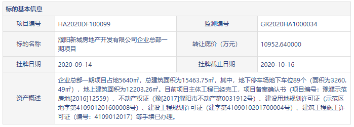 9月14日,据河南省公共资源交易中心消息,濮阳新城房地产开发有限公司企业总部一期项目挂牌转让,转让底价10952.64万元,挂牌公告期为21个工作日,9月14日至10月16日。...