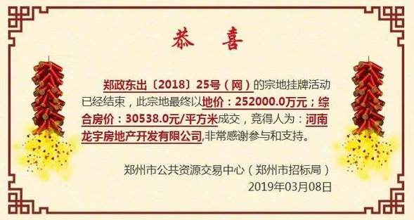 3月8日,备受瞩目的北龙湖25号地(97.04亩),在经过一番激烈的争夺后,被河南龙宇房地产有限公司(建业)以熔断地价252000万元,综合房价30538元/平方米竞得。据悉,郑政东出[2018]25号地块位于九如东路东、如意河东二街南,土地用途为城镇住宅。