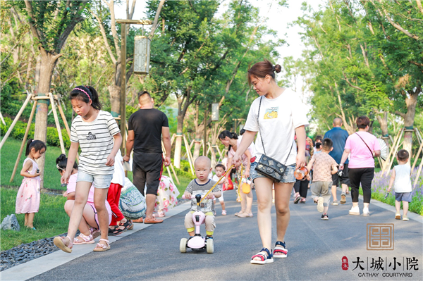 样板楼所见南北双庭院,前庭院,是待友会客的礼仪“门面”,与友共茗一壶,对弈赏月,拾掇假山水池,看绿藤爬满。而后庭院,让心灵的舒展宁静终有着落。老人在自己的花圃,培花莳草,触摸瓜果的生长实况,而孩子放学拥有了另一个课堂,在人生第一方鱼池,和鱼儿斗智斗勇,看见从未见过的鸟类,爱上自然。