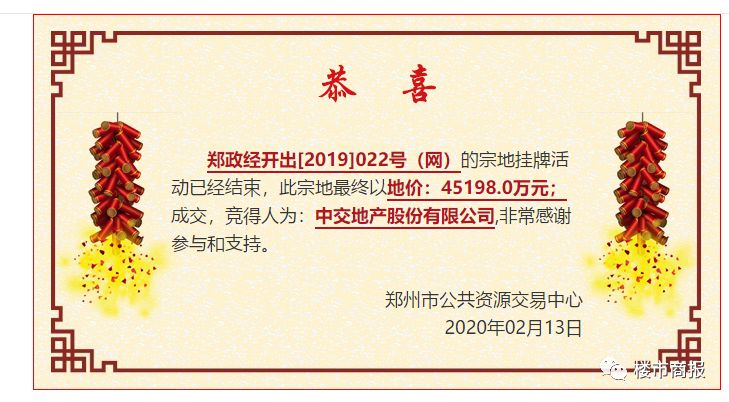 郑政经开出[2019]023号(网)被中交地产股份有限公司以52466.0万元摘得,折合1369万/亩,8211元/㎡,溢价率9%。