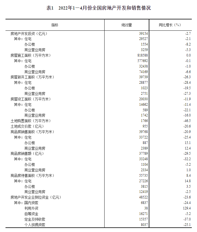 1—4月份,房地产开发企业房屋施工面积818588万平方米,同比持平。其中,住宅施工面积577692万平方米,同比下降0.1%。房屋新开工面积39739万平方米,下降26.3%。其中,住宅新开工面积28877万平方米,下降28.4%。房屋竣工面积20030万平方米,下降11.9%。其中,住宅竣工面积14662万平方米,下降11.4%。