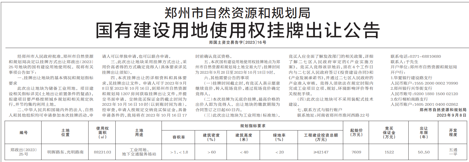 【大河财立方消息】9月8日,郑州市自然资源和规划局公告称,决定以挂牌方式出让郑政出〔2023〕25号地块的国有建设用地使用权。
