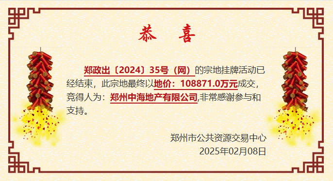 2月8日,在经历了约6小时的激烈竞拍后,中海地产以10.88亿元摘得郑政出〔2024〕35号(网)地块,溢价87%。